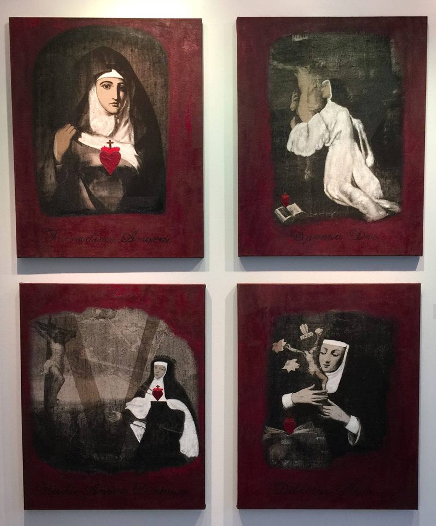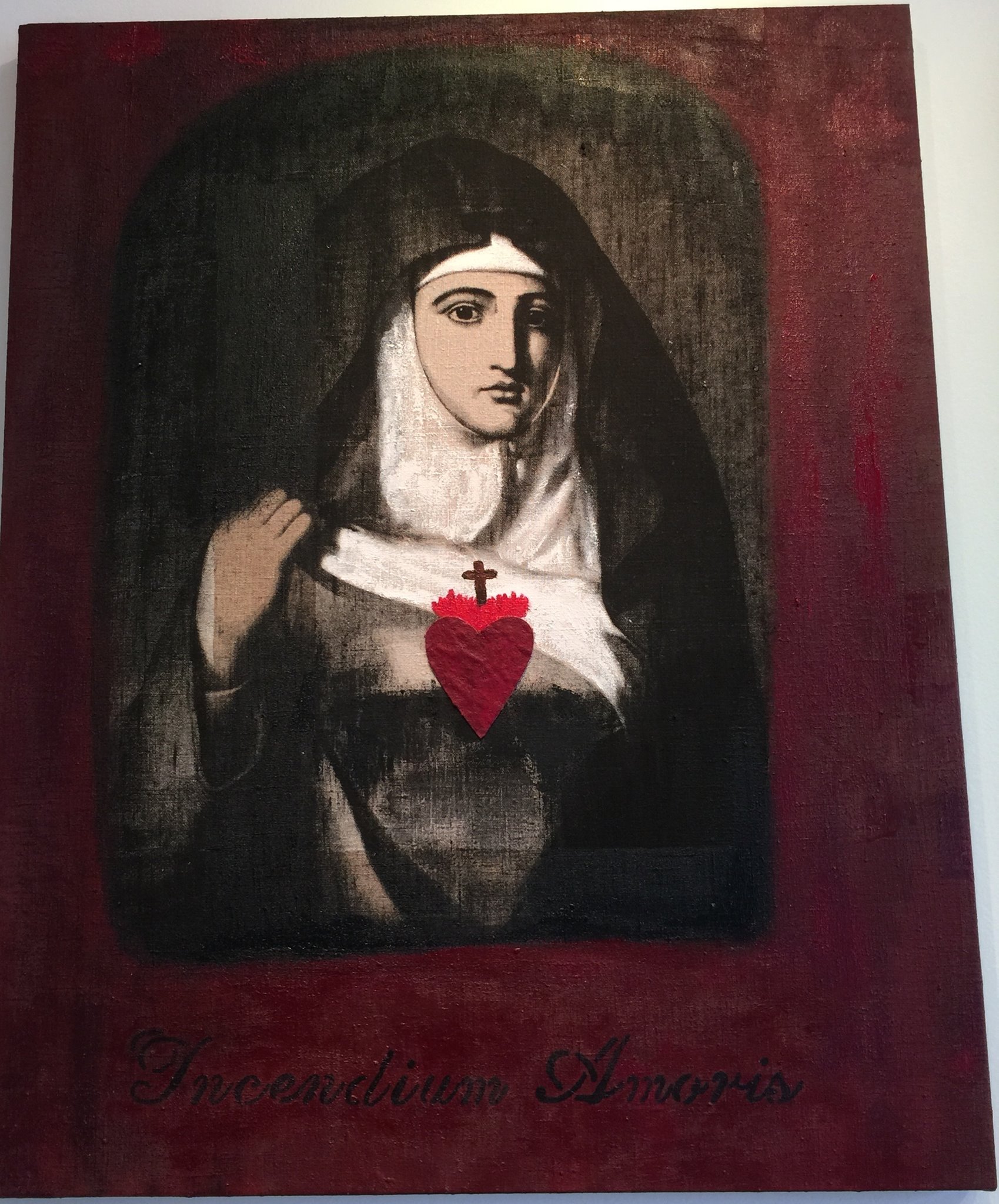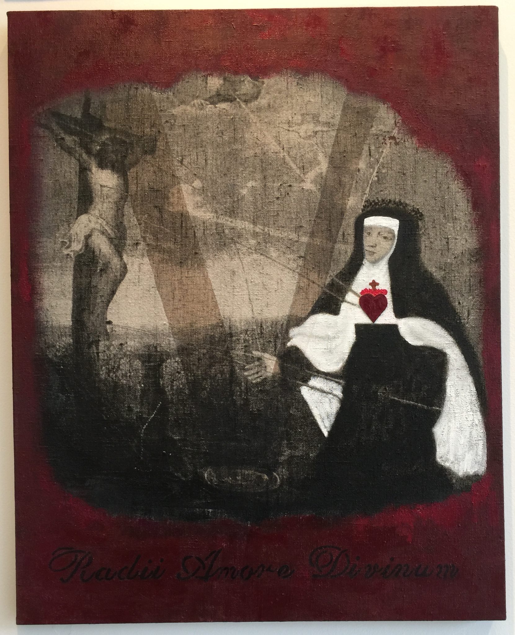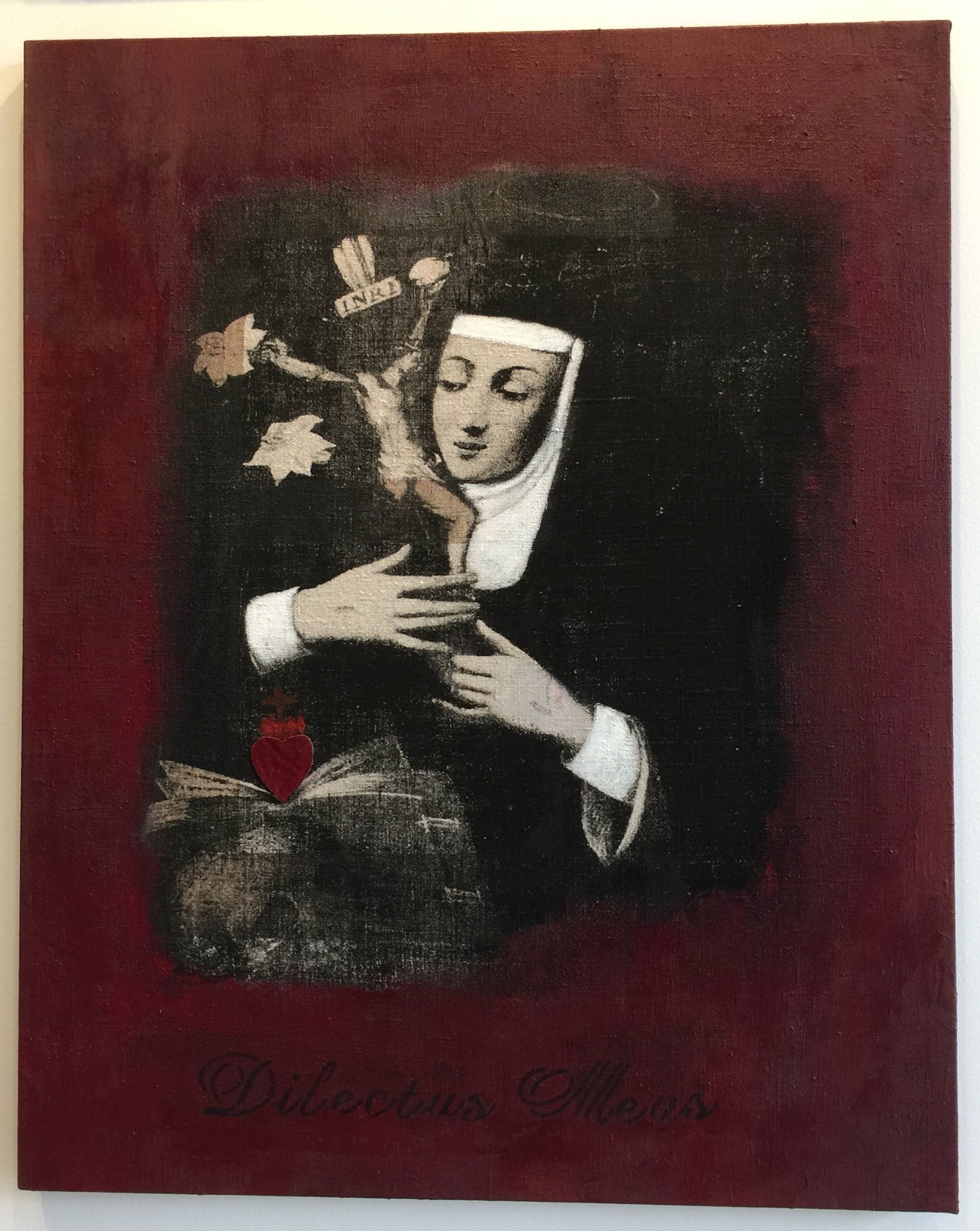 Specifically, Habit appropriates a number of visual representations of the nun so plentifully available on-line, in print, and in other media, in order to re-cast and transform them. For example, in a number of paintings, images of mystic nuns originally painted in the early modern period are silk screened onto different grounds—linen, paper, etc.,–and then painted over, or assembled in different ways to create new visual representations that underscore the power of deliberate mis-readings (and/or the foregrounding of missed readings) for a feminist analysis. In other works, photographs sourced from early-modern convent art, present-day fashion advertisements, and book illustrations from different periods are assembled and painted over to emphasize both the instability of the symbol, and the feminist potential of exploring that instability. One other painting makes explicit the personal scope of this project by incorporating a photograph of me as a ten-year-old wearing a nun’s habit for the Catholic ritual of First Communion. In a few other pieces (3-D assemblages and installations), I explore the overlap of mystic love and human passion (in the series “Burning Love”), as well as the overlap of scholarship and art (in the series “Vocation”). The final piece, “Altar” (still in progress), literalizes the metaphors that underscore the whole project: the work notes for Altered Habits, as well as the pages from the book manuscript are transformed into small pellets that fill three hand-blown hour glasses, which are then installed on antique silver coasters, and over linen cloths.