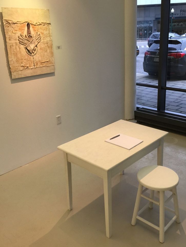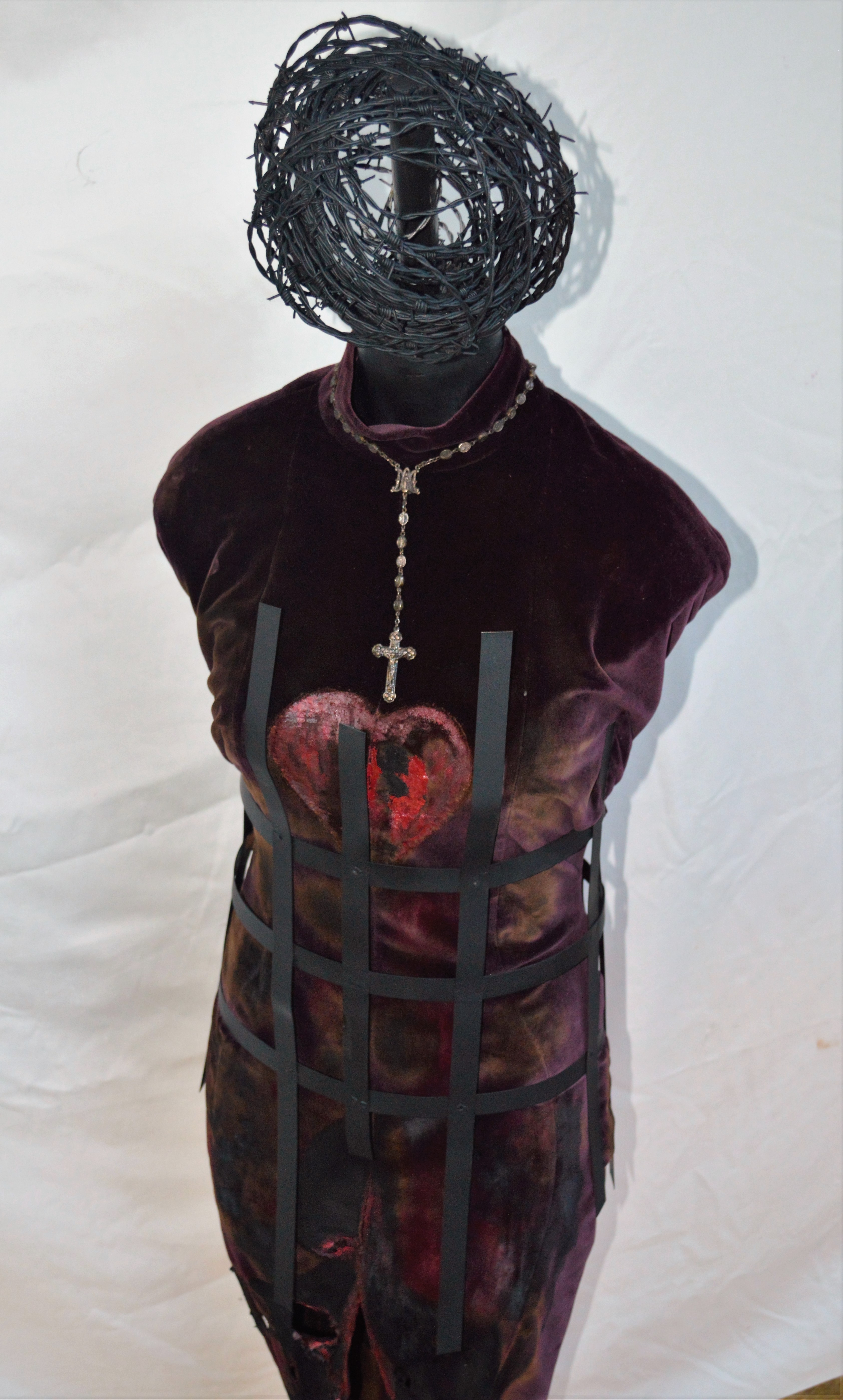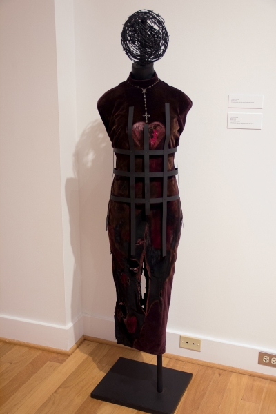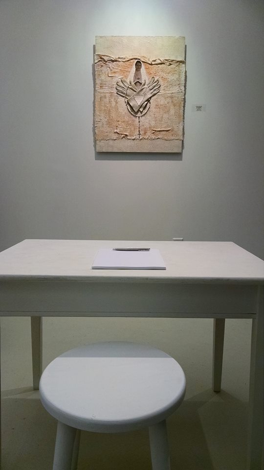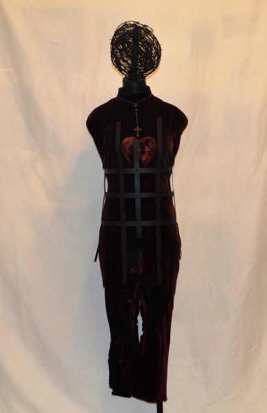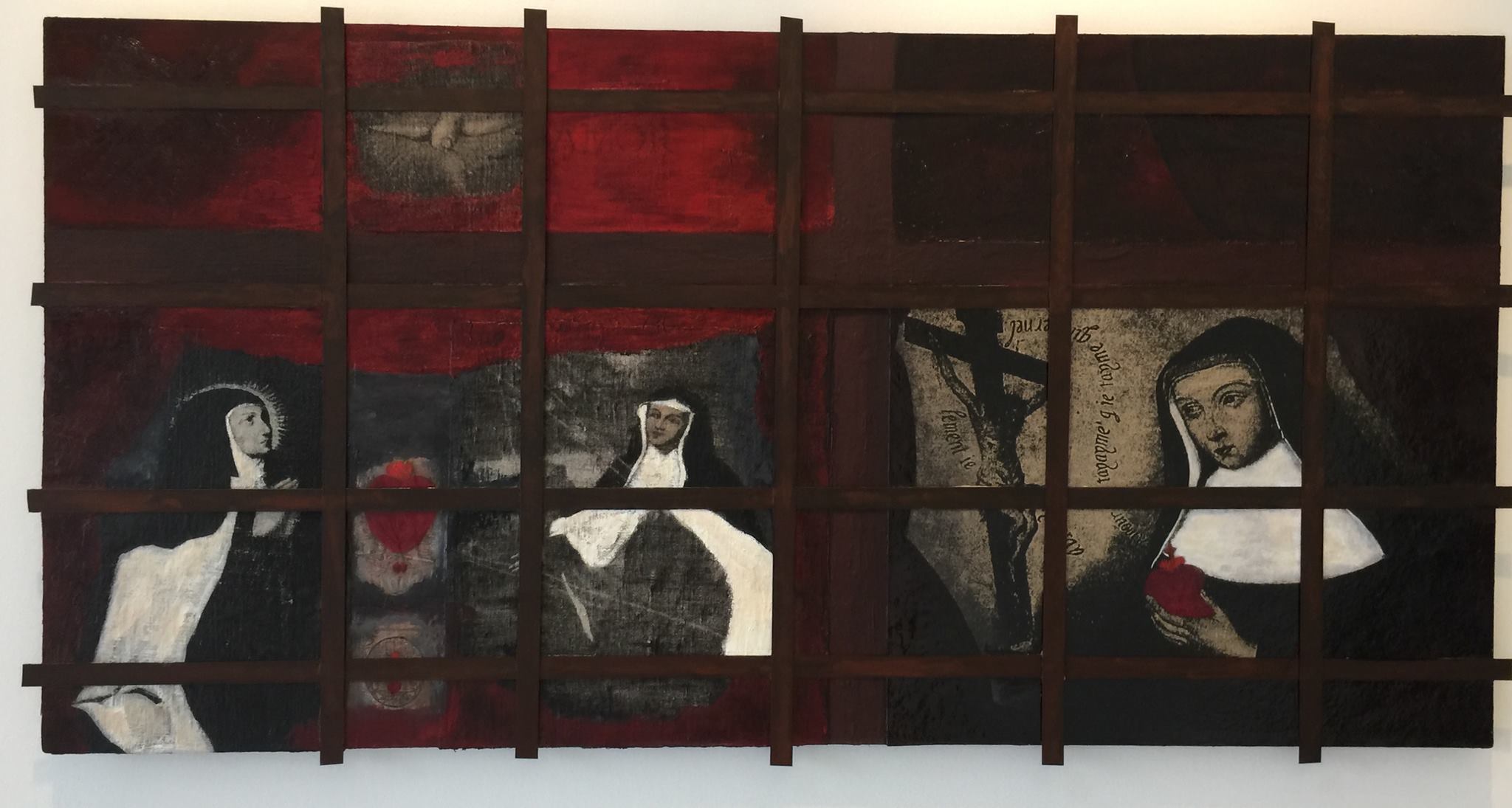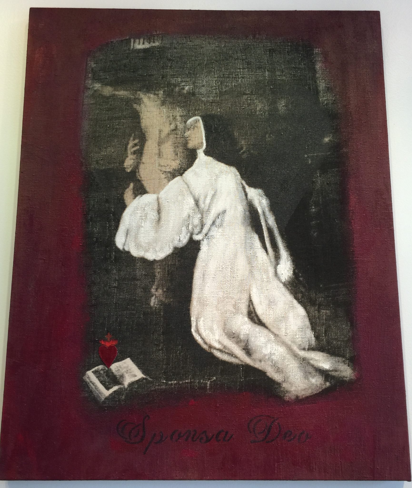 Specifically, Habit appropriates a number of visual representations of the nun so plentifully available on-line, in print, and in other media, in order to re-cast and transform them. For example, in a number of paintings, images of mystic nuns originally painted in the early modern period are silk screened onto different grounds—linen, paper, etc.,–and then painted over, or assembled in different ways to create new visual representations that underscore the power of deliberate mis-readings (and/or the foregrounding of missed readings) for a feminist analysis. In other works, photographs sourced from early-modern convent art, present-day fashion advertisements, and book illustrations from different periods are assembled and painted over to emphasize both the instability of the symbol, and the feminist potential of exploring that instability. One other painting makes explicit the personal scope of this project by incorporating a photograph of me as a ten-year-old wearing a nun’s habit for the Catholic ritual of First Communion. In a few other pieces (3-D assemblages and installations), I explore the overlap of mystic love and human passion (in the series “Burning Love”), as well as the overlap of scholarship and art (in the series “Vocation”). The final piece, “Altar” (still in progress), literalizes the metaphors that underscore the whole project: the work notes for Altered Habits, as well as the pages from the book manuscript are transformed into small pellets that fill three hand-blown hour glasses, which are then installed on antique silver coasters, and over linen cloths.