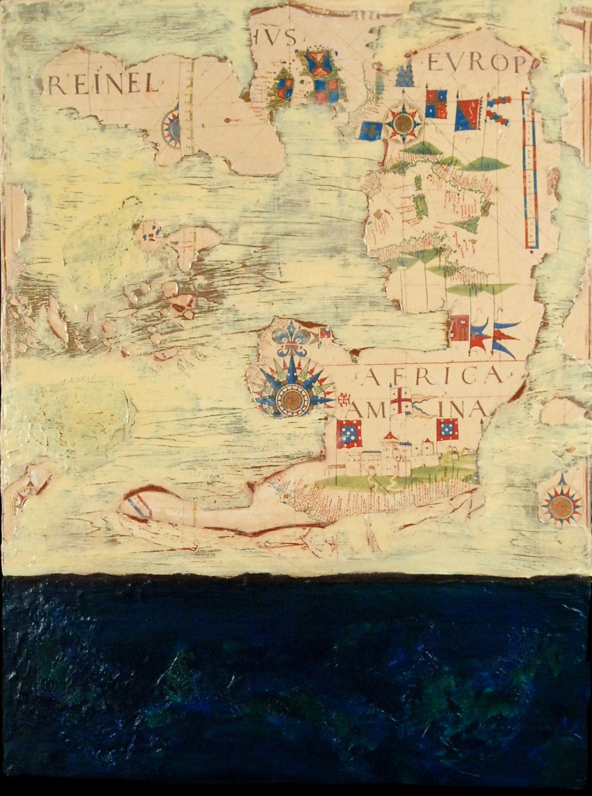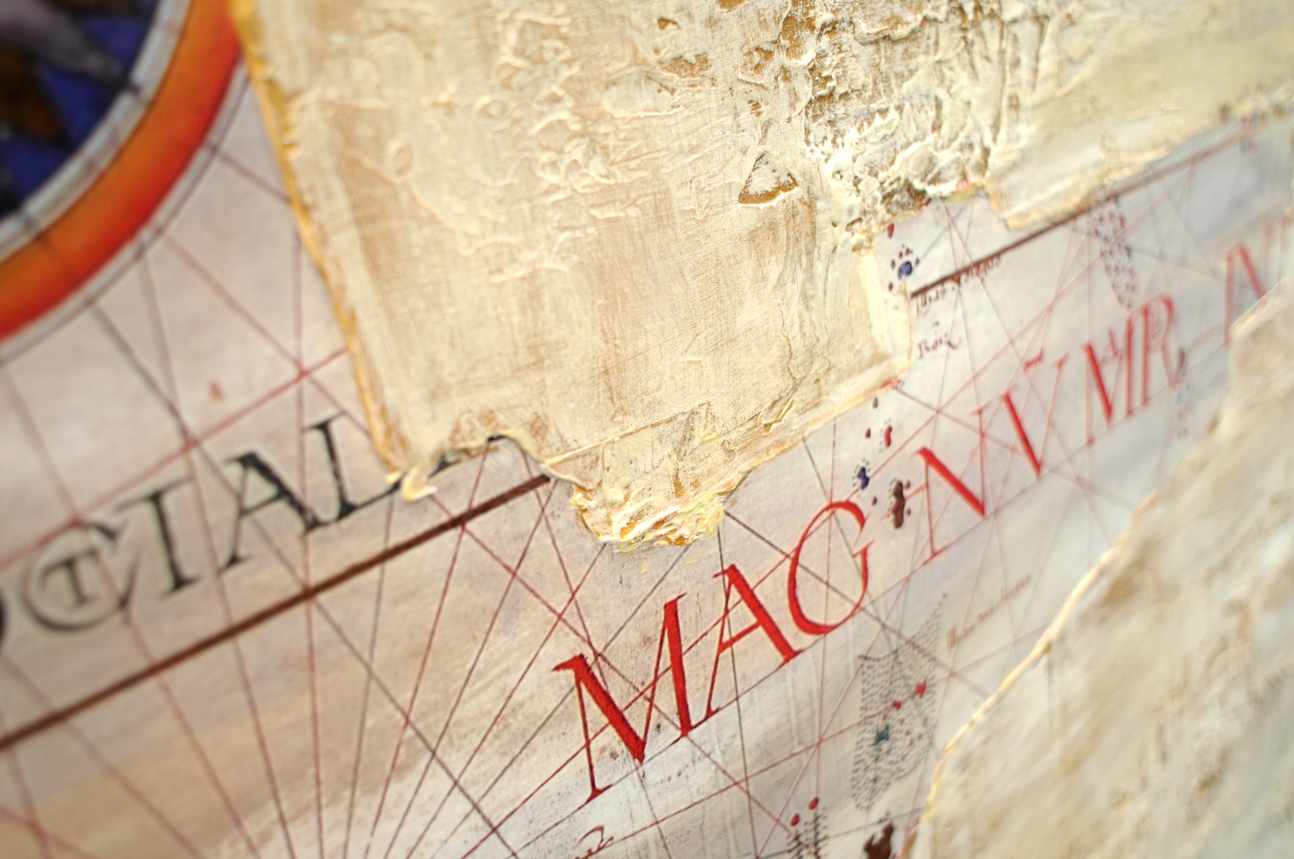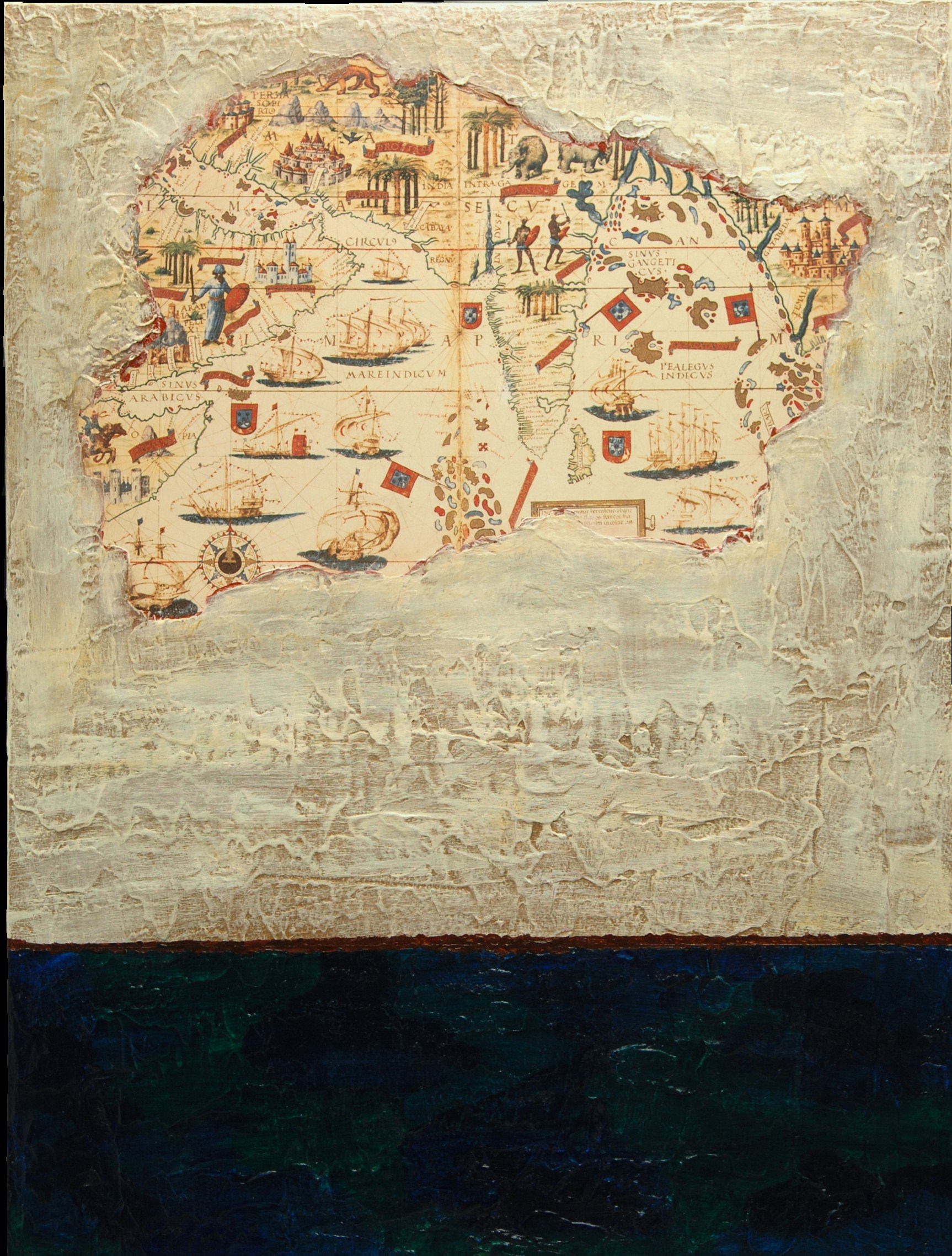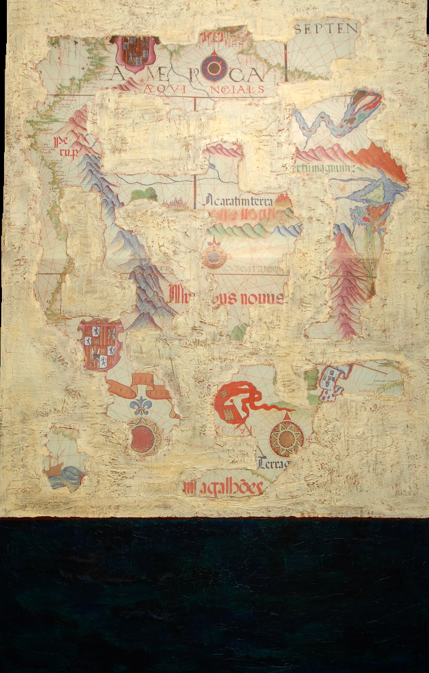 The paintings in Whitewash seek to contribute to this reflection by bringing together three central and inter-related elements of the Portuguese discoveries: the ocean (the way to expansion), the maps (the records of that expansion), and whiteness (the racial formation resulting from that expansion). These three elements are, therefore, the metaphors that anchor this project. The paintings are done over reproductions of sixteenth-century maps documenting the contemporary Portuguese presence in the oceans of the world. These maps, selected from the work of early-modern Portuguese cartographers, are painted over in different values of white, their surface eroded in order to problematize the very concept of whiteness. At the bottom and/or sides of the paintings there is an area in a deep blue-green color representing the ocean and evoking the notion of a seaborne empire central to the 16th-century Portuguese concept of nation.