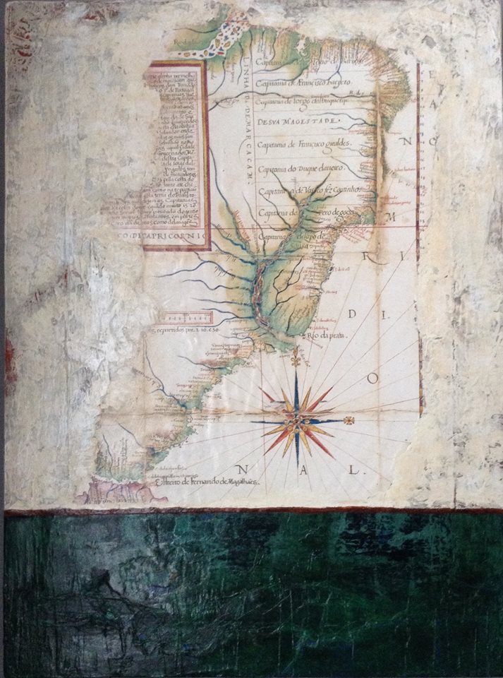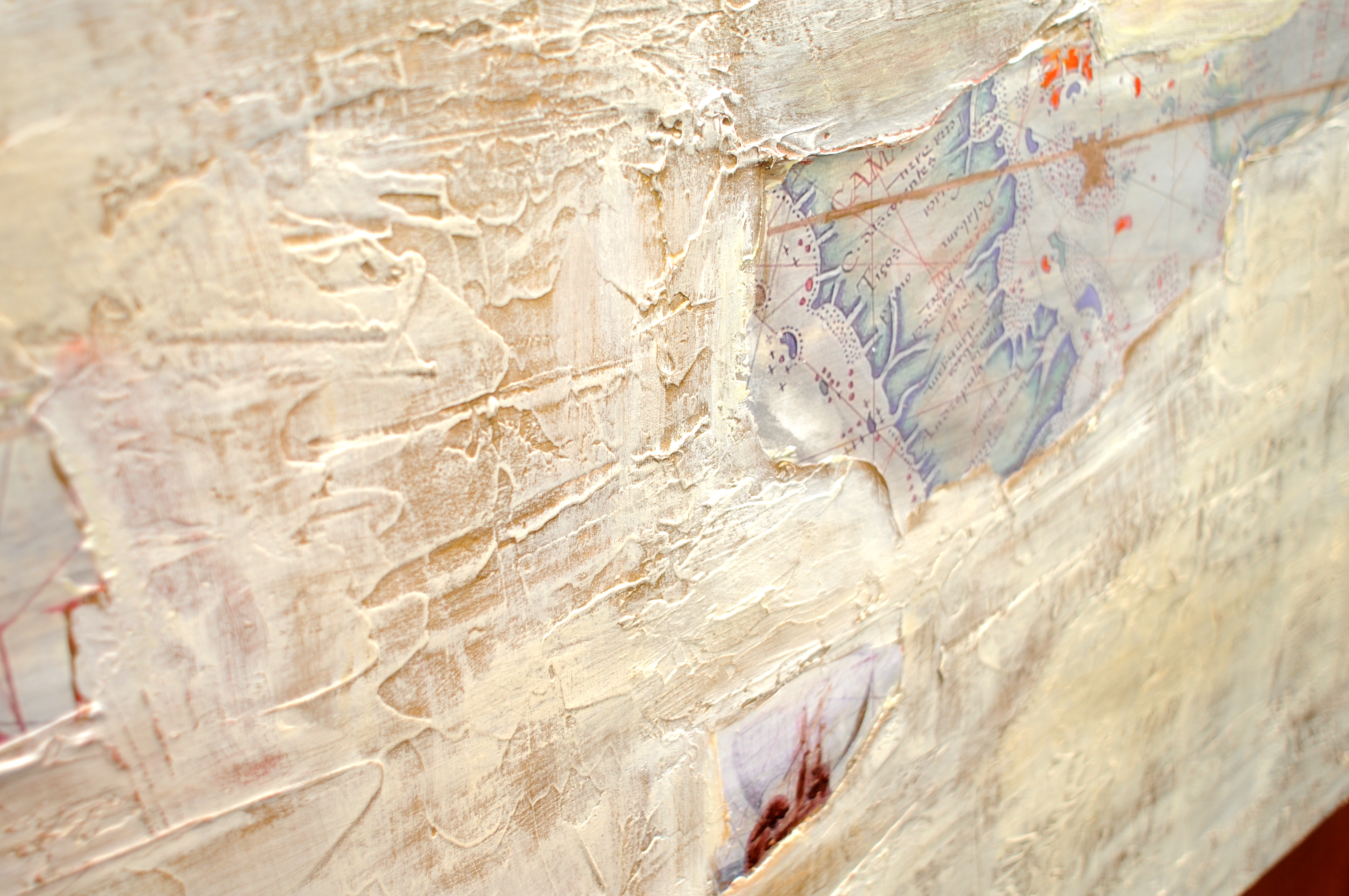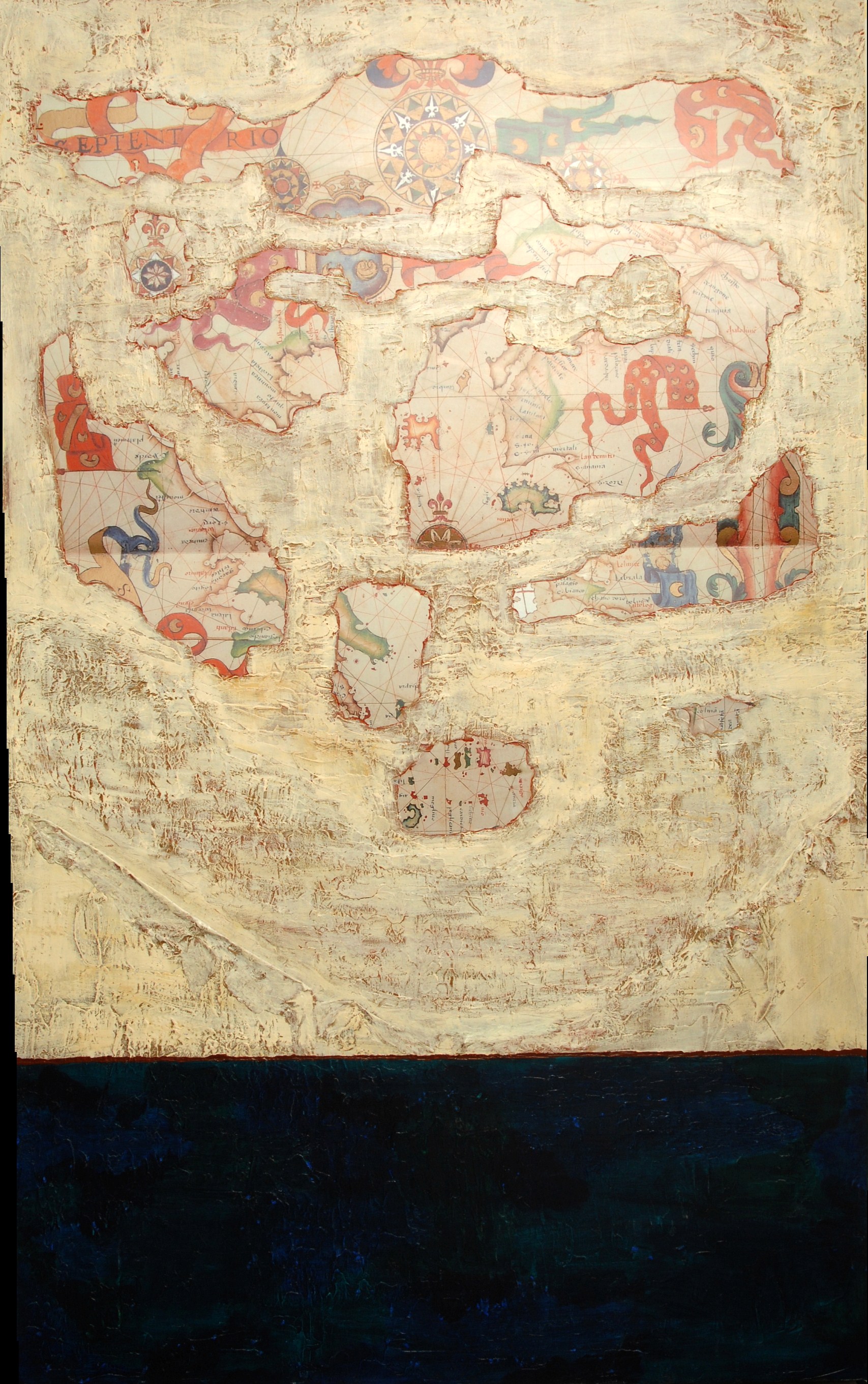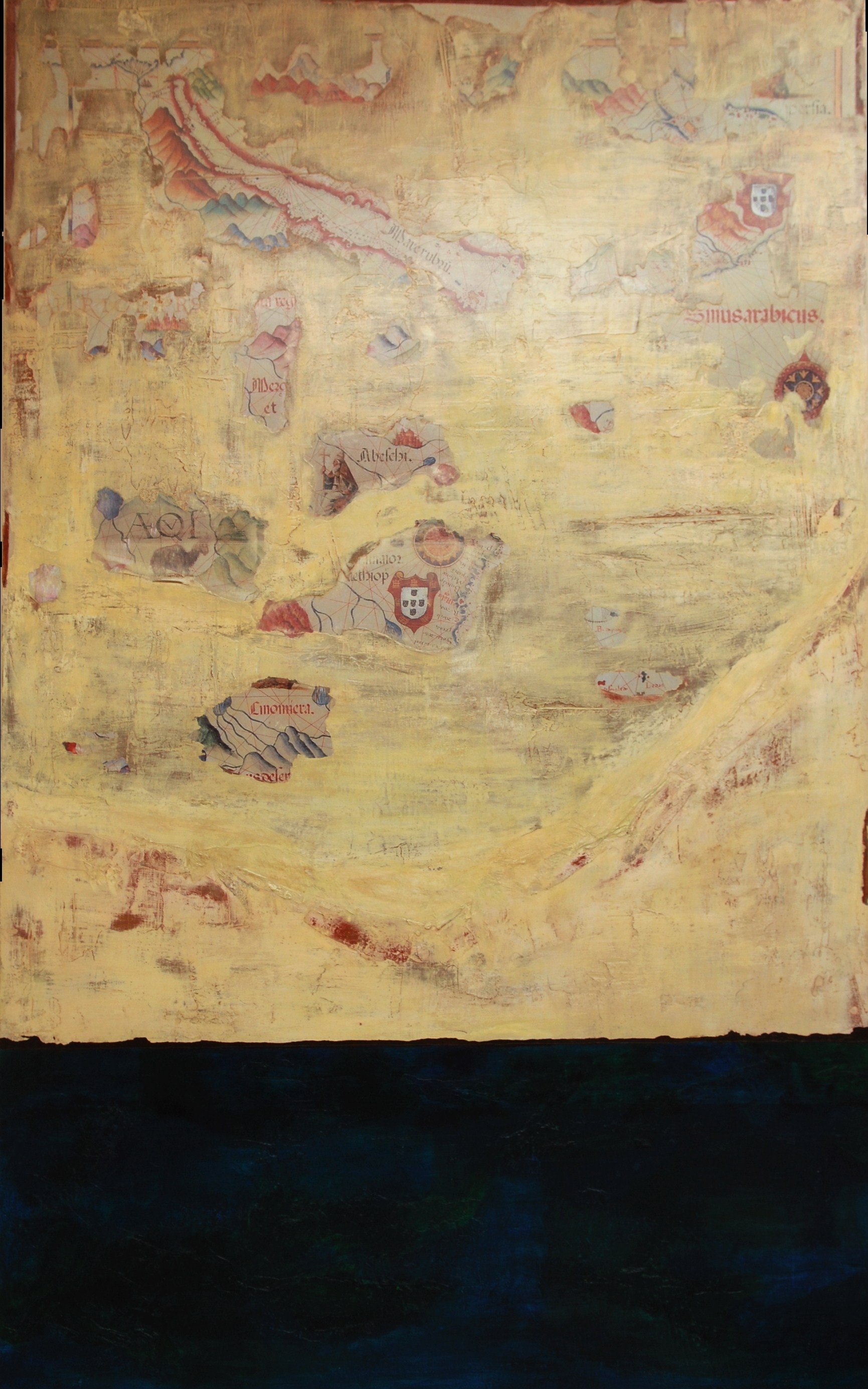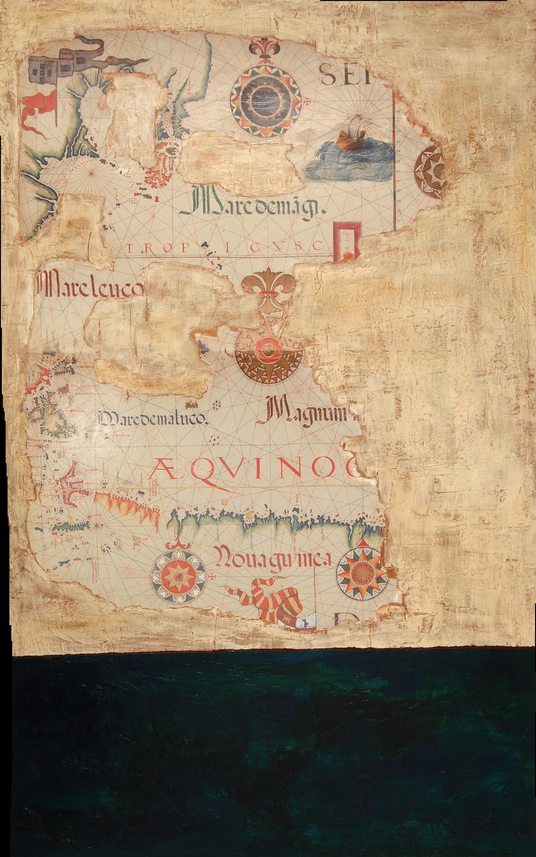 The paintings in Whitewash seek to contribute to this reflection by bringing together three central and inter-related elements of the Portuguese discoveries: the ocean (the way to expansion), the maps (the records of that expansion), and whiteness (the racial formation resulting from that expansion). These three elements are, therefore, the metaphors that anchor this project. The paintings are done over reproductions of sixteenth-century maps documenting the contemporary Portuguese presence in the oceans of the world. These maps, selected from the work of early-modern Portuguese cartographers, are painted over in different values of white, their surface eroded in order to problematize the very concept of whiteness. At the bottom and/or sides of the paintings there is an area in a deep blue-green color representing the ocean and evoking the notion of a seaborne empire central to the 16th-century Portuguese concept of nation.