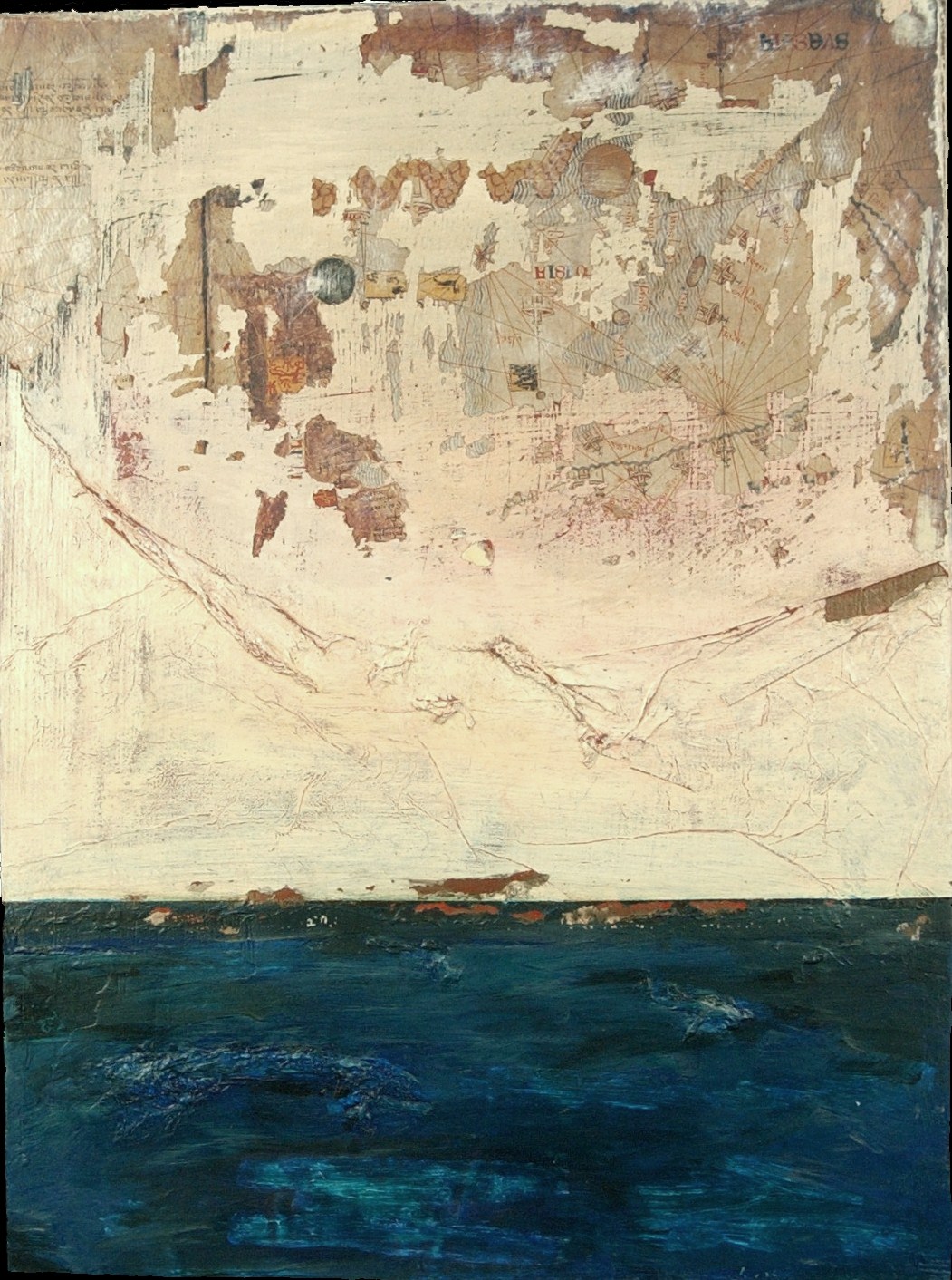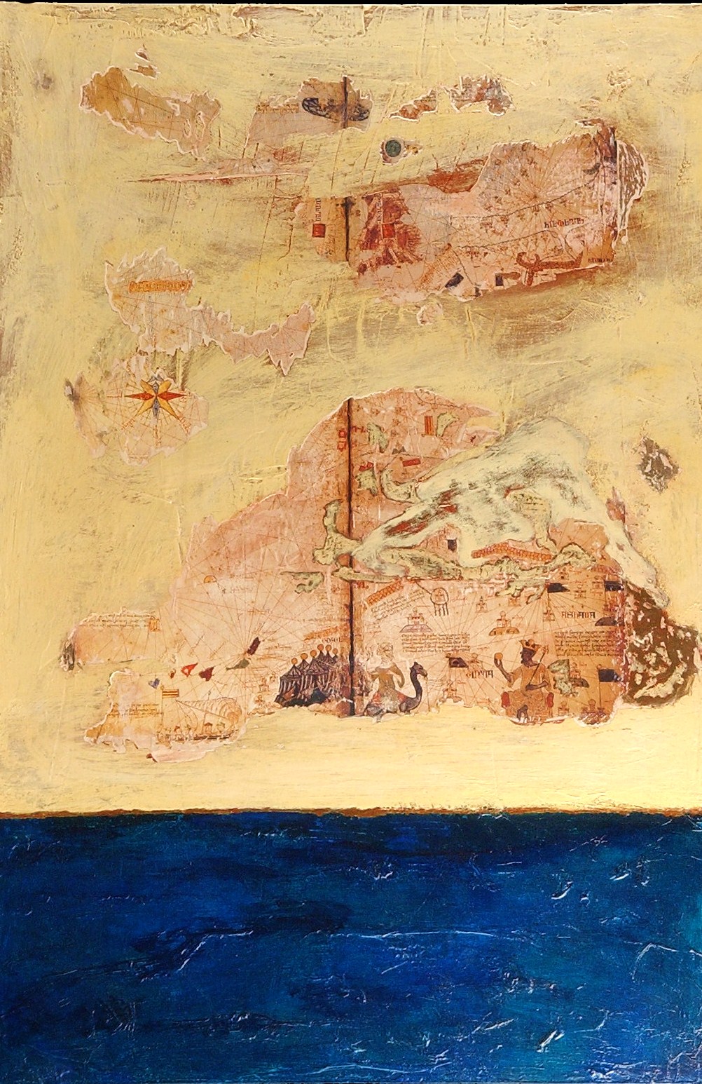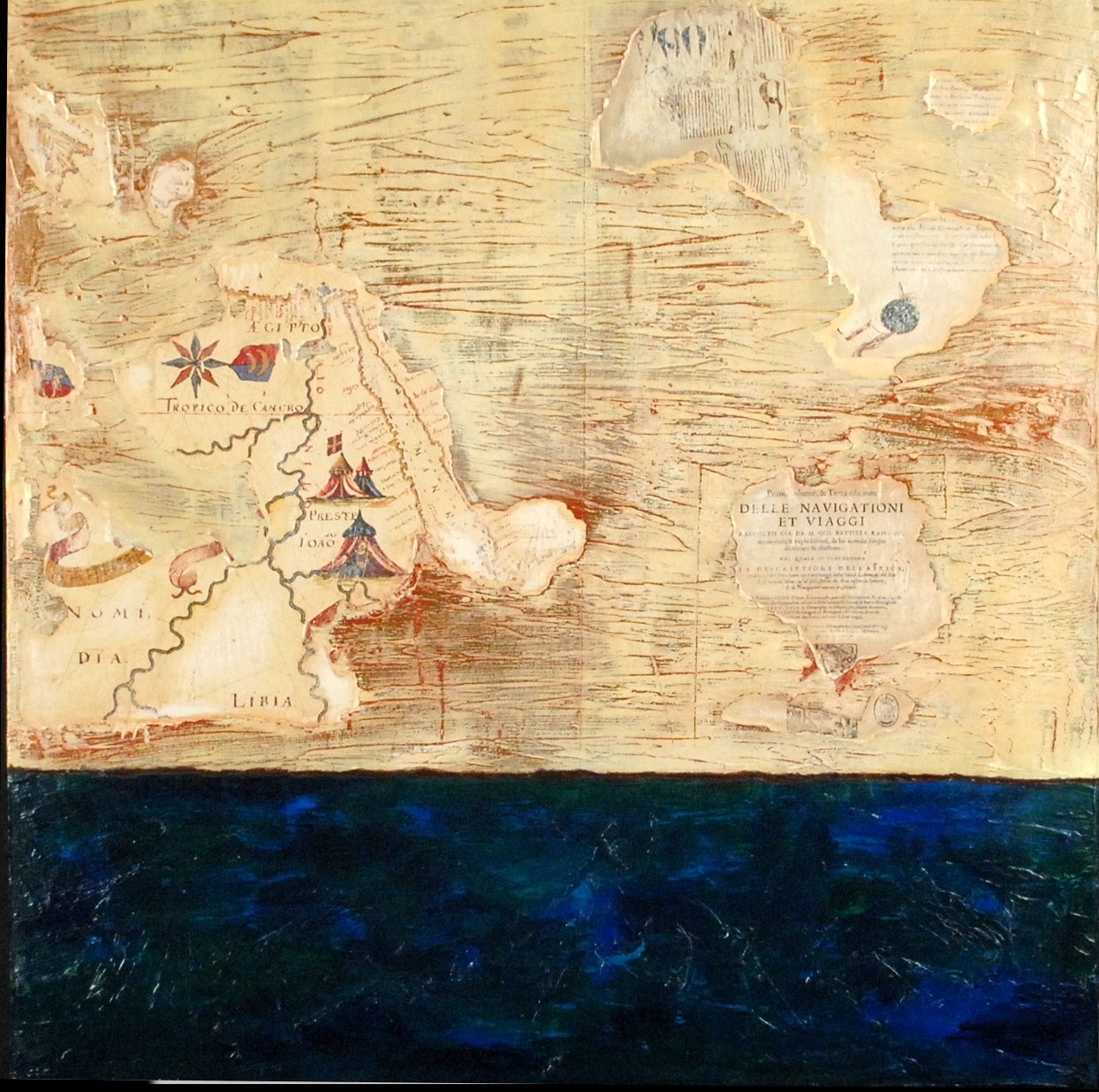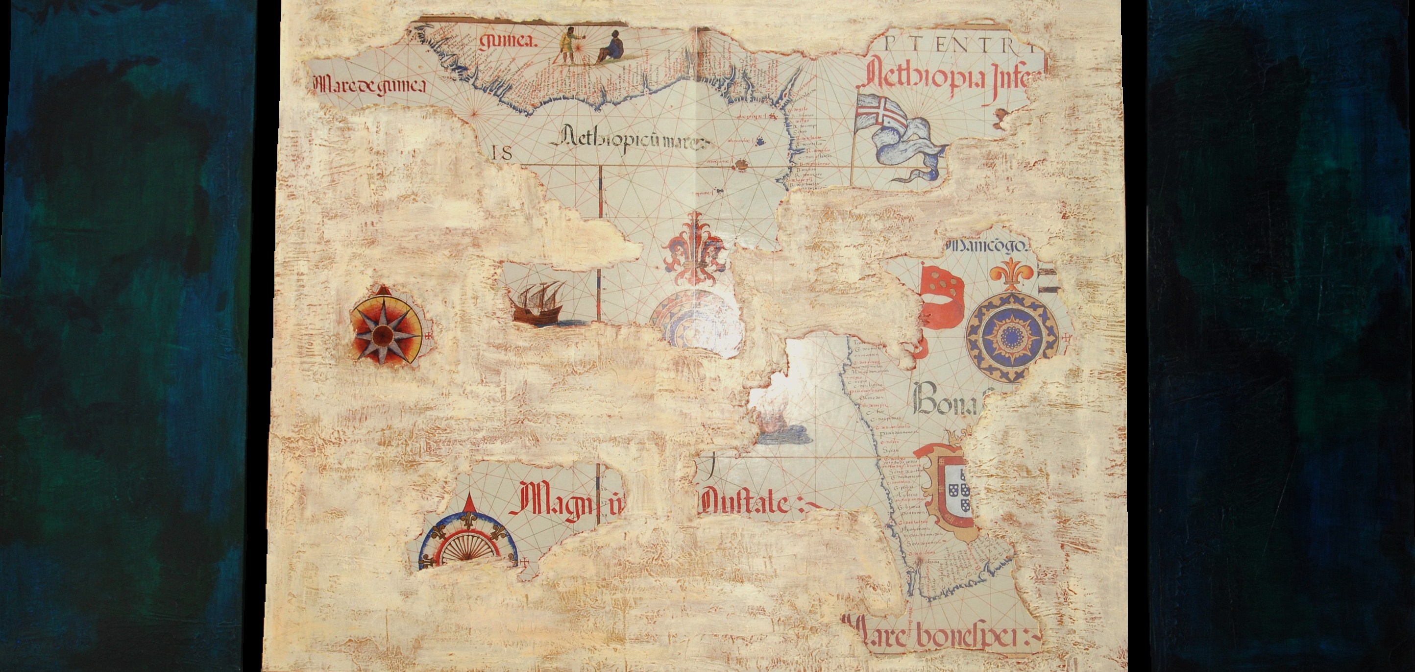 The paintings in Whitewash seek to contribute to this reflection by bringing together three central and inter-related elements of the Portuguese discoveries: the ocean (the way to expansion), the maps (the records of that expansion), and whiteness (the racial formation resulting from that expansion). These three elements are, therefore, the metaphors that anchor this project. The paintings are done over reproductions of sixteenth-century maps documenting the contemporary Portuguese presence in the oceans of the world. These maps, selected from the work of early-modern Portuguese cartographers, are painted over in different values of white, their surface eroded in order to problematize the very concept of whiteness. At the bottom and/or sides of the paintings there is an area in a deep blue-green color representing the ocean and evoking the notion of a seaborne empire central to the 16th-century Portuguese concept of nation.
